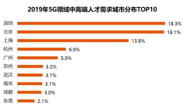 从2019年5G领域中高端人才需求城市分布TOP10来看,深圳对5G人才的需求最旺盛,其以18.3%的占比位居第一;北京紧随其后,以18.1%的占比位居第二;上海排名第三,人才需求占比为13.8%。