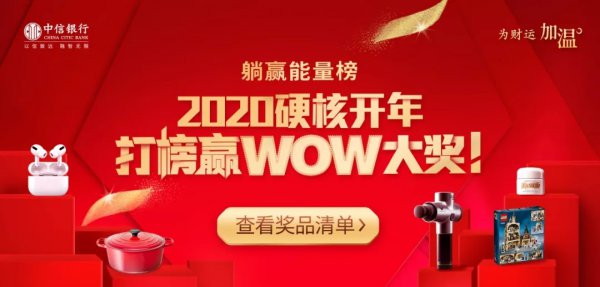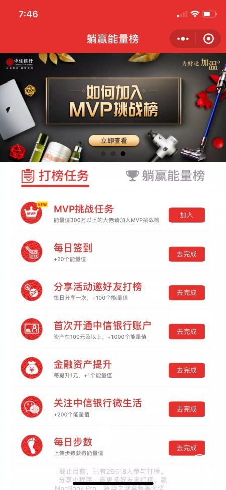 【躺赢能量榜】是中信银行为客户定制的有奖打榜活动,玩法非常简单。依托微信小程序,用户注册小程序后,可以做任务、攒能量,靠能量值排名赢大奖。躺赢能量榜设有全国个人能量排行榜、分行个人能量排行榜、MVP挑战榜三大榜单。每月排名靠前的客户,可以获得苹果笔记本电脑、戴森吸尘器、海蓝之谜面霜等众多有吸引力的大奖。