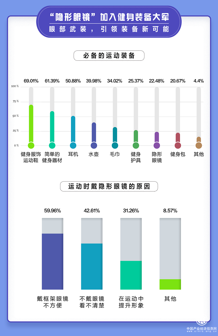 其中56%的健身爱好者表示期待有运动专属的隐形眼镜,高水润、高透氧是运动人士选择隐形眼镜时首先考虑的因素。其中,更加卫生舒适的日抛和月抛正在成为健身界的宠儿。