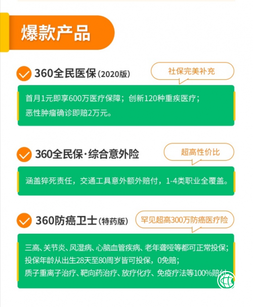 其中,360全民医保(2020版)、360全民保·综合意外险、360防癌卫士(特药版)等产品由于产品设计贴近用户需求,覆盖责任全赢得用户信赖,成为爆款产品。360全民医保作为第一款独家定制医疗险,被评价是社保的有力补充,其最高一年可提供高达600万元的医疗费用保障,保障年龄高至65岁,可续保至99岁,包含120种重疾医疗,同时恶性肿瘤确诊即赔2万元,不限社保内外用药,放疗、化疗、靶向药、质子重离子治疗等可获100%赔付。
