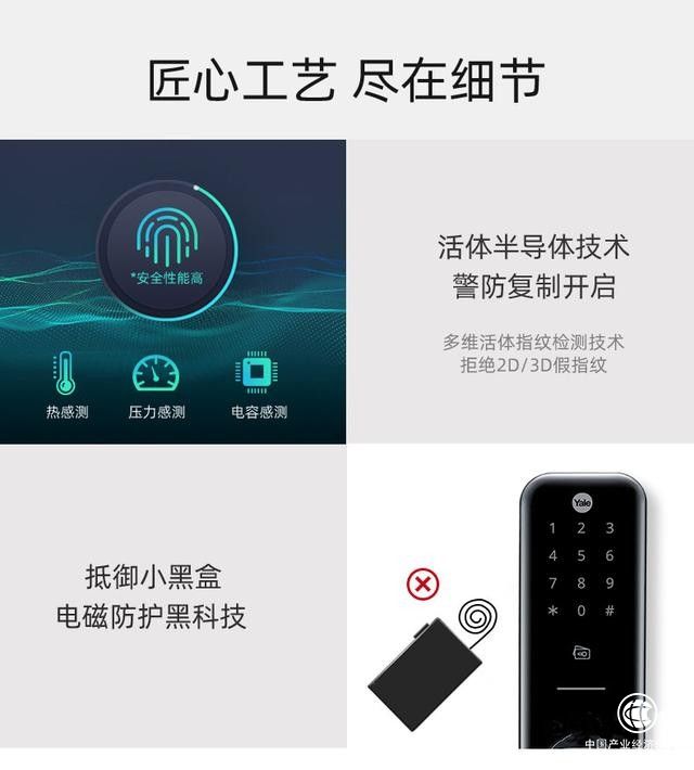 耶鲁智能锁采用了先进的FPS半导体活体指纹识别技术及防指纹触摸屏,反应更加灵敏的同时,真正做到 0 残留指纹,有效防止复制指纹,轻松实现拒绝假指纹。