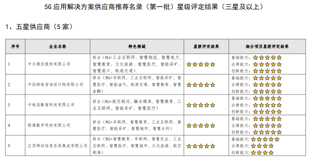 图片来源:5G应用解决方案供应商推荐名录(第一批)星级评定结果公示