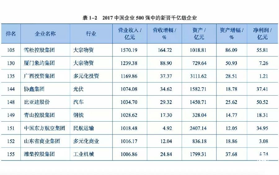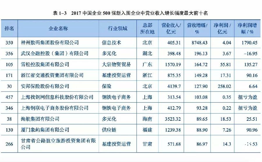 2017中国企业500强中有55家企业新入围,包括神州数码集团股份有限公司、雪松控股集团、中国林业集团、深圳顺丰泰森控股集团、百丽国际控股有限公司。