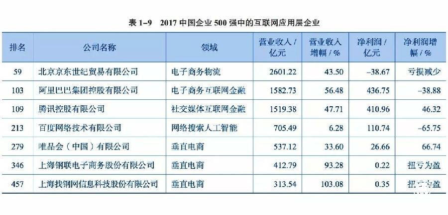 值得一提的是,以互联网企业为代表的新经济崛起,是最近十年中国经济发展的突出特征。2017中国企业500强中,互联网应用层的企业有6家,包括4家平台型互联网公司:百度、阿里巴巴、腾讯、京东;2家垂直电商公司:钢联电子商务、找钢网。京东、阿里巴巴、腾讯经过2016年的超高速成长(50%左右的营业收入增长率),全部进入2017世界500强。作为垂直型电商的代表,唯品会、钢联电子商务、找钢网分别成立于2008年、2000年、2012年,它们凭借短短十余年甚至几年的高速成长,第一次荣登中国企业500强之列,显示出垂直电商在中国的蓬勃发展态势。