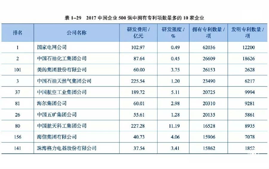 2017中国企业500强中有373家企业提供了专利数据(没有部分知名企业如华为的专利数据),合计拥有专利73.72万件,其中发明专利22.94万件。