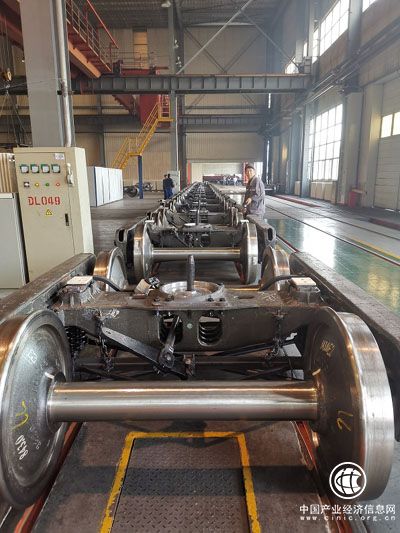 在中车齐车公司转向架车间,车间安全组长高峰向采访团成员介绍了车间进行的车轴精加工、组装成轮对、台车组装到最后的货车转向架系列工序。