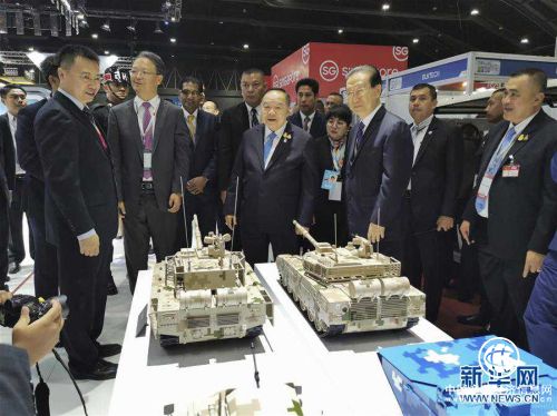 11月18日,泰国副总理巴威(中)在泰国曼谷举行的国际防务展上参观中国展区。