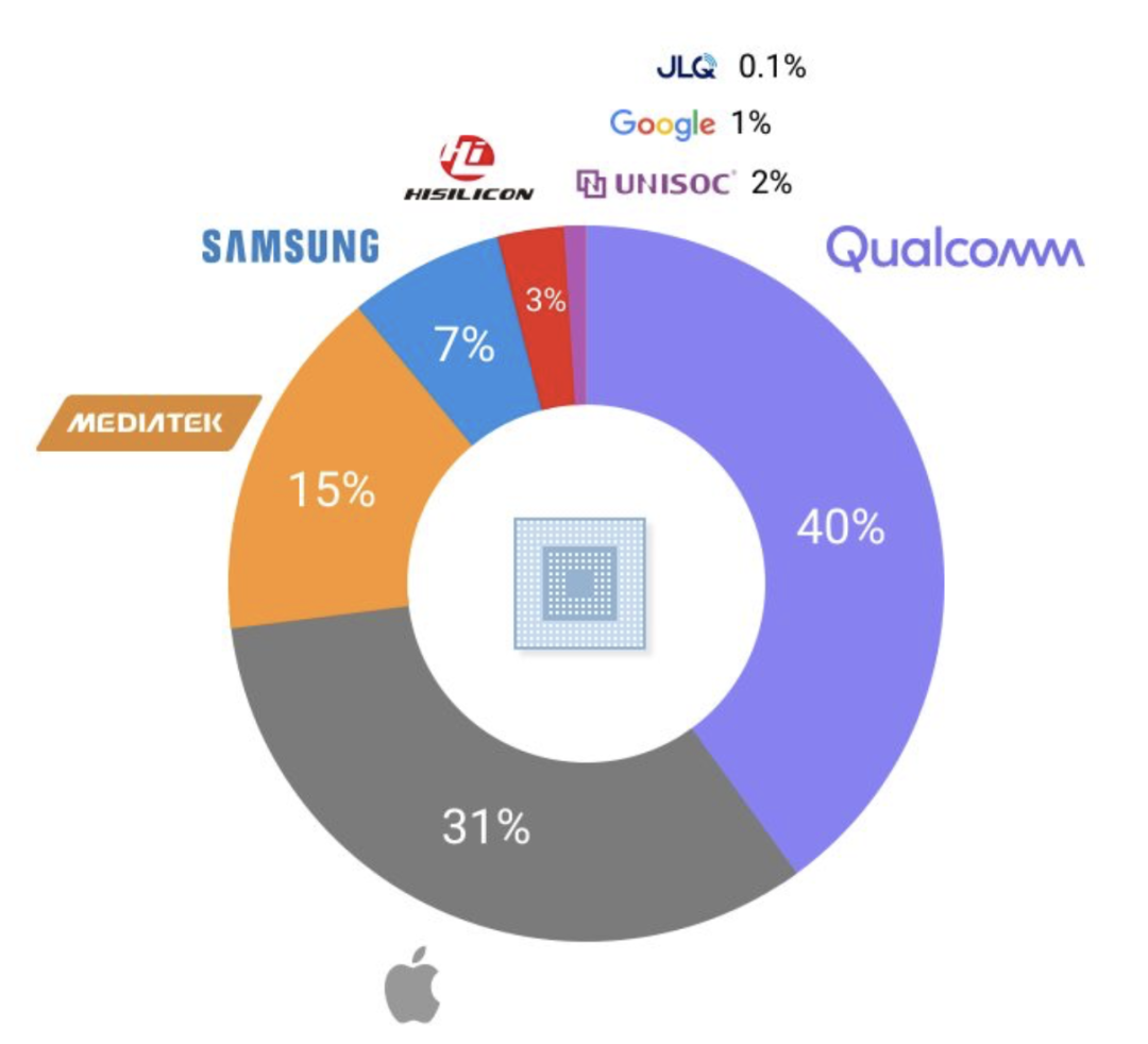 具体而言,高通以40%营收份额位居第1,苹果31%份额紧随其后。联发科份额15%、三星7%、海思3%、展锐2%。