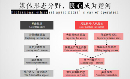 凤凰网早在去年就给了大家答案:“人机智能”。与算法驱动的资讯分发平台的简单推送不同,凤凰网以内容+技术两条线路,发挥编辑与机器的能动性,提供给用户既能覆盖其价值需求,也能满足其个性化选择的优质内容。一方面,凤凰网对技术的应用不仅仅停留在抓取和分发,而是将热点反哺编辑,以实现更具用户价值的专业内容的生产;另一方面,在进行分发时,用户收到的前30条信息是由编辑严格把控,既提供满足用户个人喜好度的内容,也保证用户可以获取有价值的高品质内容。