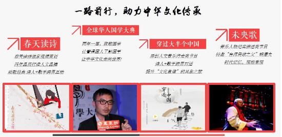 热度升级共聚焦四大垂直消费领域,文化、体育、泛娱乐、轻生活。打造垂直领域IP,与主流用户连接,让品牌融入生活。文化方面凤凰网携手深圳卫视打造了一档国内首创的户外文化探寻节目——《一路书香》,这个节目是窦文涛《锵锵三人行》之后的全新亮相。窦文涛化身书店老板,将汽车打造成移动书屋带你行万里路读万卷书,并且邀请许子东、陈晓等多位名人共同参与。强强联合的《一路书香》势必成为文化类热门节目。除此之外,凤凰网还有携手诗人和歌手跨界互动的《春天读诗》、两年一届致敬国学的《全球华人国学大典》、原创人文音乐行走类节目《穿过大半个中国》和胡德夫主持的人文纪实讲述类节目《未央歌》。