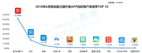 2018年6月,这次行人群平均安装职场应用数量为1.66个,平均使用数量1.55个,在职场社交、求职招聘、能力提升、基础办公等几大细分领域,用户安装和使用数量均不足2个的情况下,纵深拓展机会依旧明显。脉脉也同样在努力打造,职场社交之外更多维度的职场赋能平台。目前,脉脉在能力提升领域已经跻身前三,与喜马拉雅、知乎一起,领跑行业细分市场。