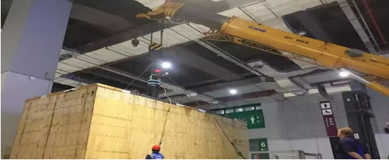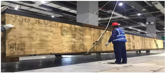 鑫机缘记者在现场看到,载着金牛座龙门铣的12辆中国国际进口博览会大件展品物流专车驶入国家会展中心7.1馆,随即由中方、外方组成的3+6现场施工小组,进行现场拆箱。龙门铣共有26个木制包装箱包含床身、导轨、工作台、横梁、溜板、滑枕、立柱等核心部件,截至目前长达13米也是零部件中最长的床身包装箱已打开。