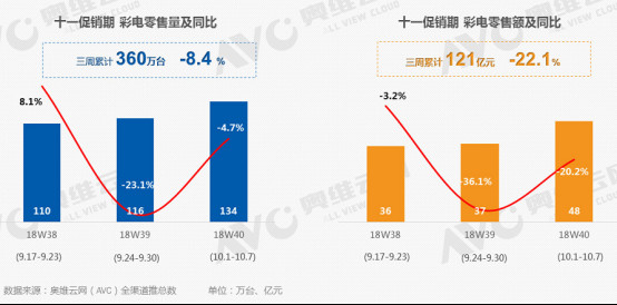 权威市场调研机构奥维云网(AVC)发布的《2018年中国彩电市场“十一”促销总结报告》显示,受存量市场需求不振的影响,十一促销期经历了多年的持续下滑,今年再次创造了历史新低。数据显示, 今年十一促销期累计彩电零售量为360万台,同比下降8.4%,零售额121亿元,同比下降22.1%,彩电行业又开始“入冬”了。