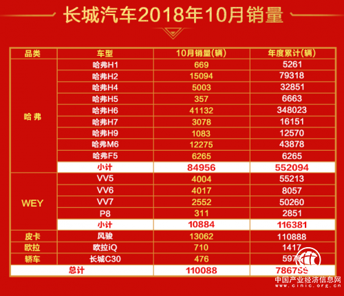 11月7日,长城汽车发布2018年10月份销售数据,总销量再度跨过10万辆大关,共销售110,088台,在整体市场增速放缓的背景下,逆势环比暴涨27%。其旗下哈弗品牌,再创销量奇迹,10月全系销量达到84,956台,较9月环比再增近40%,再现一车难求局面,成中国SUV市场绝对王者。