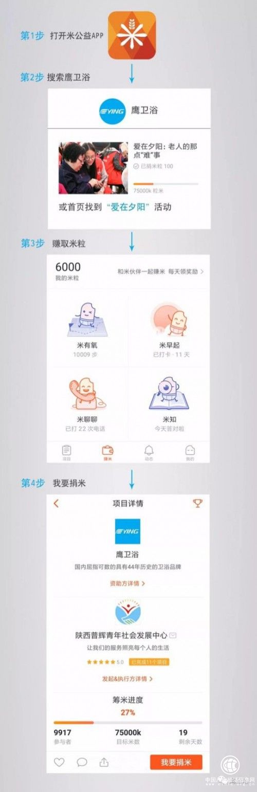鹰卫浴邀请热爱公益,关心孤寡残障老人的你,一起加入马桶捐赠筹米活动。参与方式非常简单:下载米公益APP——》找到鹰卫浴“爱在夕阳|老年人的那点难事”筹米活动——》捐赠米粒。