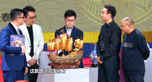 “‘太平聚瑞’赏瓶,以陶瓷打造瓶身,配饰唐卷草纹图案,中间结合3D打印技术呈现的古法琉璃,演绎蔚蓝的大海,寓意世界文化大融合。”参赛者“高调”的介绍让国礼的霸气虹贯全场。这方大家还沉浸在“太平聚瑞”气场中,那边工美集团则又为大家带来了曾赠送给英国女王、印度总统的“双国礼”。“萌叔”姚劲波爱不释手,居然现场“讨价还价”,引发全场爆笑。