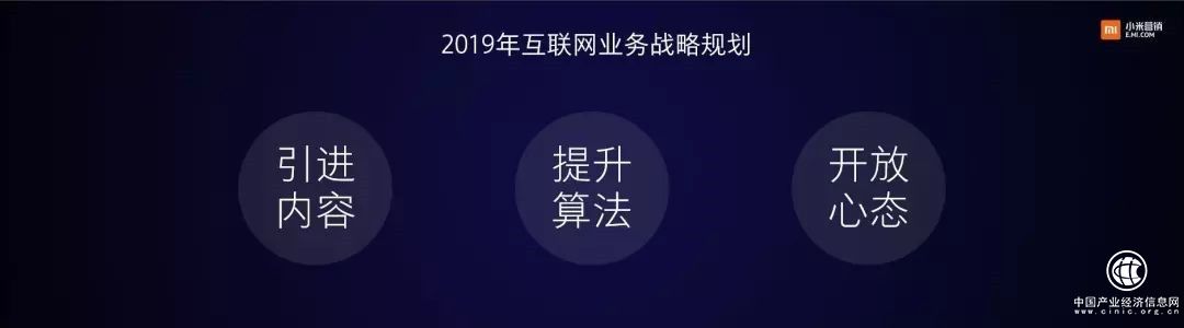 2019年,小米的互联网业务不仅要实现增长,更要实现技术、内容、效率的转变,小米集团互联网一部总经理李伟星提出三个关键词:“内容、算法、开放”。