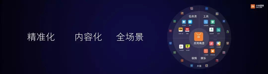仇睿恒提出3个关键词:精准化、内容化、全场景。例如“女神专区”“二楼”这样精准化的专区与内容栏目,以及浏览器、全局搜索、小米音乐、小米主题、多看阅读等各场景下的创意分发媒介,旨在通过内容与场景的深度结合,提高用户的粘性,同时提升媒介分发的效率。