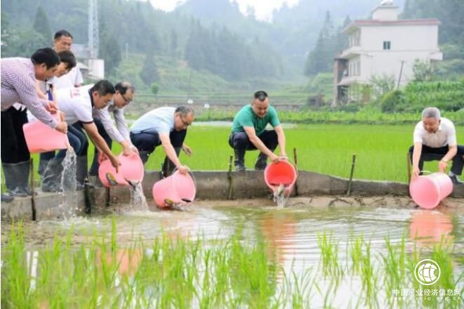 ↑泸州老窖股份有限公司党委书记、董事长刘淼(右二)带领企业员工帮扶向田村发展稻田养鱼项目 泸州老窖/供图