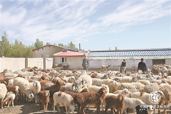 图为喀尔交镇牲畜养殖受益人塔拉普汗·沙合多拉,集中放养合作社310只羊,月增收4000元。史智峰摄