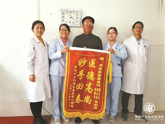 图为偏瘫患者经过两个月的康复治疗,可以生活自理,给商林康复团队送来锦旗。